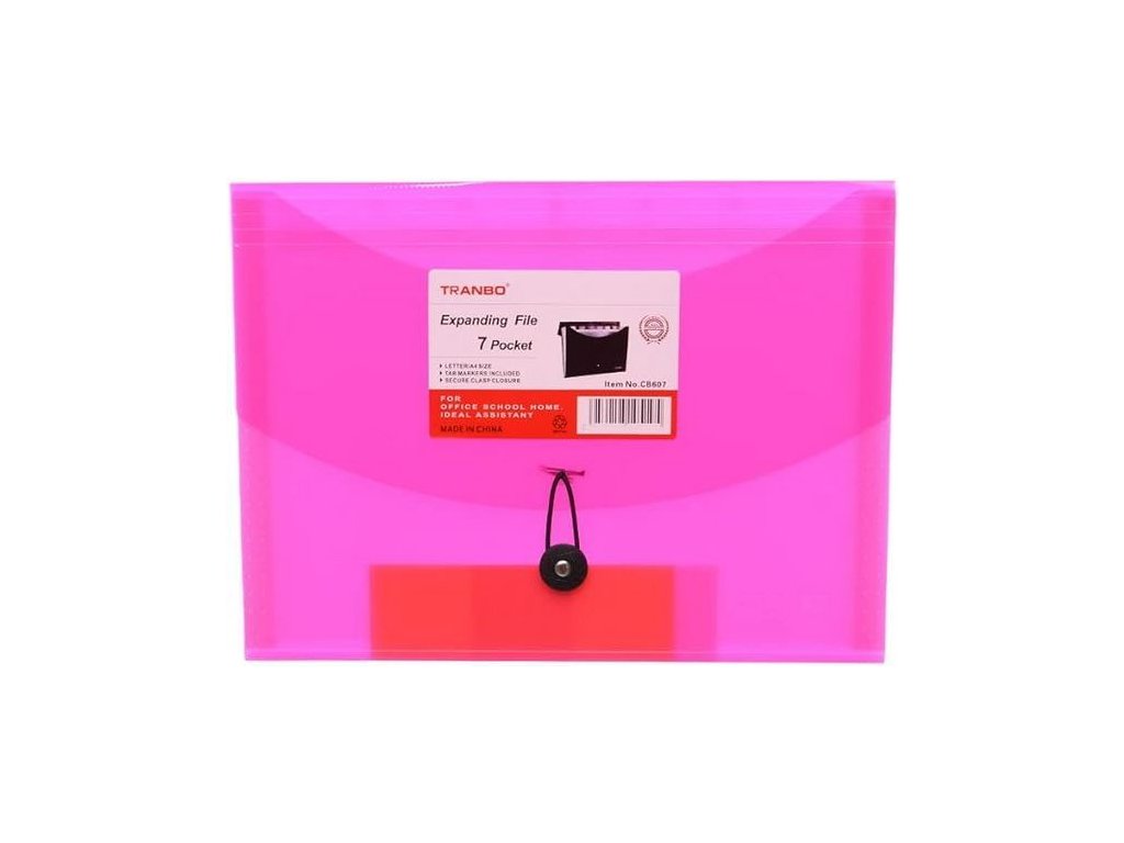 Plastový obal - box na dokumenty, průhledný barvený polypropylén, uvnitř 7 kapes na oddělení dokumentů, uzavírání na patent s gumičkou, mix 6 barev (transparentní růžová, zelená, oranžová, tyrkysová, bílá, černá, modrá, červená). Vhodné využití pro obchodníky, kanceláře i do škol. Karton 24ks, cena za 1ks.Doplňkové parametry