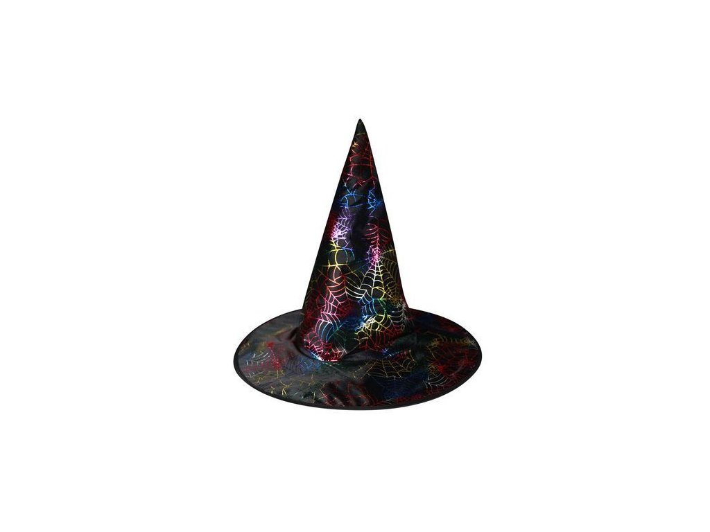 Kouzelný klobouk černé barvy zdoben barevnými magickými pavučinkami. Tento klobouk je určen pro dospělé a je ideální na čarodějnickou nebo halloweenskou oslavu.Doplňkové parametry