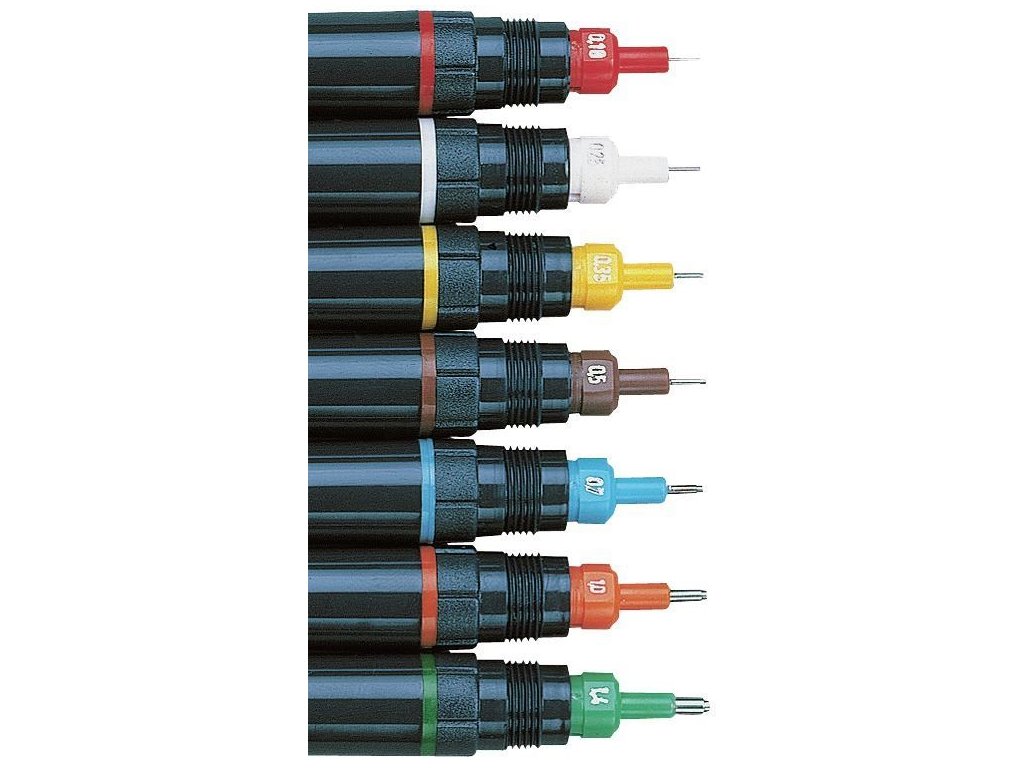 Technická trubičková pera,splňují normy ČSN, ISO, DIN,šířky stop dle typů 0,18-0,25-0,35-0,50-0,70-1,0-1,4 mm.Doplňkové parametry