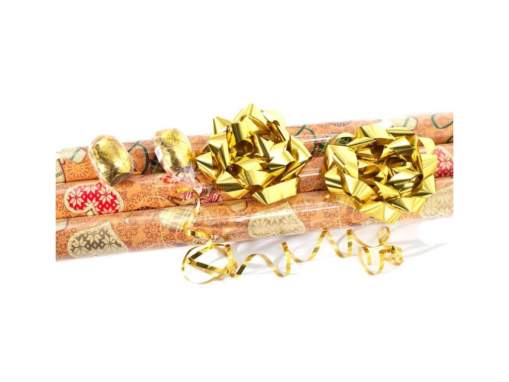 Balení dárků nikdy nebylo jednodušší! S touto balící dárkovou sadou, budou vaše dárky vkusně zabalené, sladěné. Sada obsahuje 3 role vánočního balícího papíru s tradičním vzorem ve 3 barvách, rozměr papíru je 70x200cm. Dále dvě velké zlaté lesklé samolepící rozety o velikosti 12cm, a dvě zlaté lesklé stužky o délce každá 10m.Doplňkové parametry