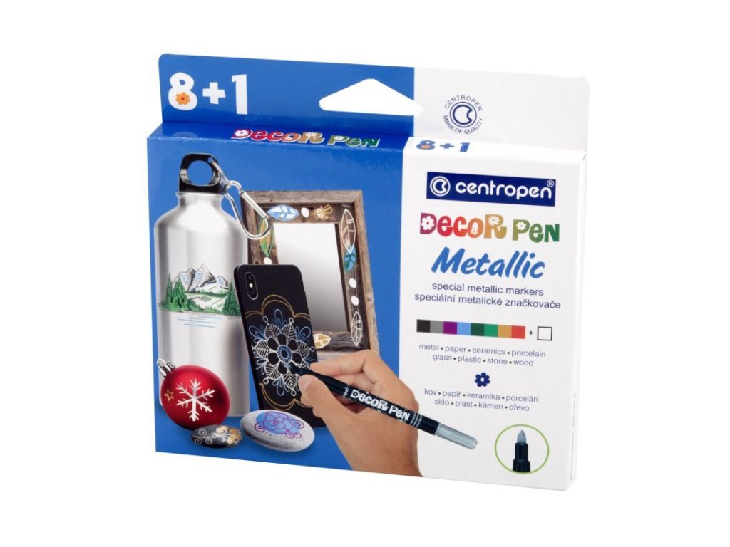 Speciální barevné metalické značkovače, na povrchy všech běžných materiálů, ERGO držení, pigmentový inkoust na vodní bázi, světlostálý, po dokonalém zaschnutí (min. 4 hod.) se stopa stává odolnou vůči otěru, na porézních površích i vodě, skladovat ve vodorovné poloze, ventilační chránítko, válcový hrot, šířka stopy 1,5 mm.Doplňkové parametry