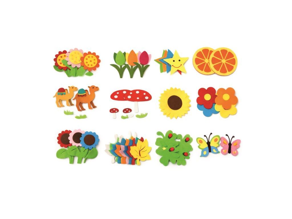 Dekorace filcové, vhodné pro kreativní tvoření a dekorování doma i ve škole, velikost dekorace 4-5cm (kytky, hvězdy, houby, motýli, srdce, listy, slunečnice, ryby, velbloudi, čtyřlístek). Mix tvarů, barev a velikostí. Nevhodné pro děti do 3 let.Doplňkové parametry