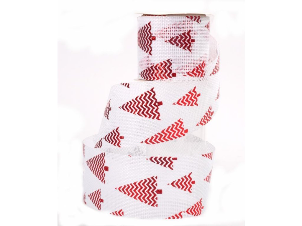 Široká vánoční jutová stuha, bílá s metalickými stromečky, čtyři barvy, červená, zlatá, zelená, stříbrná. Balení 12ks v krabici, cena za jeden návin. Rozměry 6.3cm x 275cmDoplňkové parametry