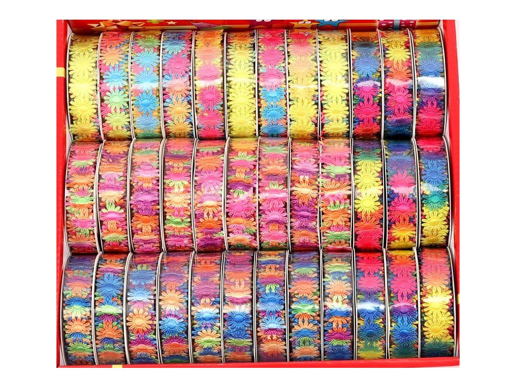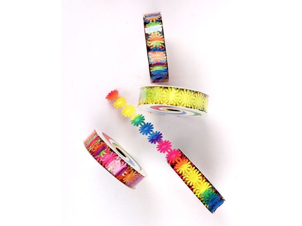 Dekorativní stuha květ šířka 18mm, délka 270cm, balení 36 ks, mix barev, cena za jeden návin. Vhodná pro veselé balení dárků a kreativní tvoření doma i ve škole.Doplňkové parametry