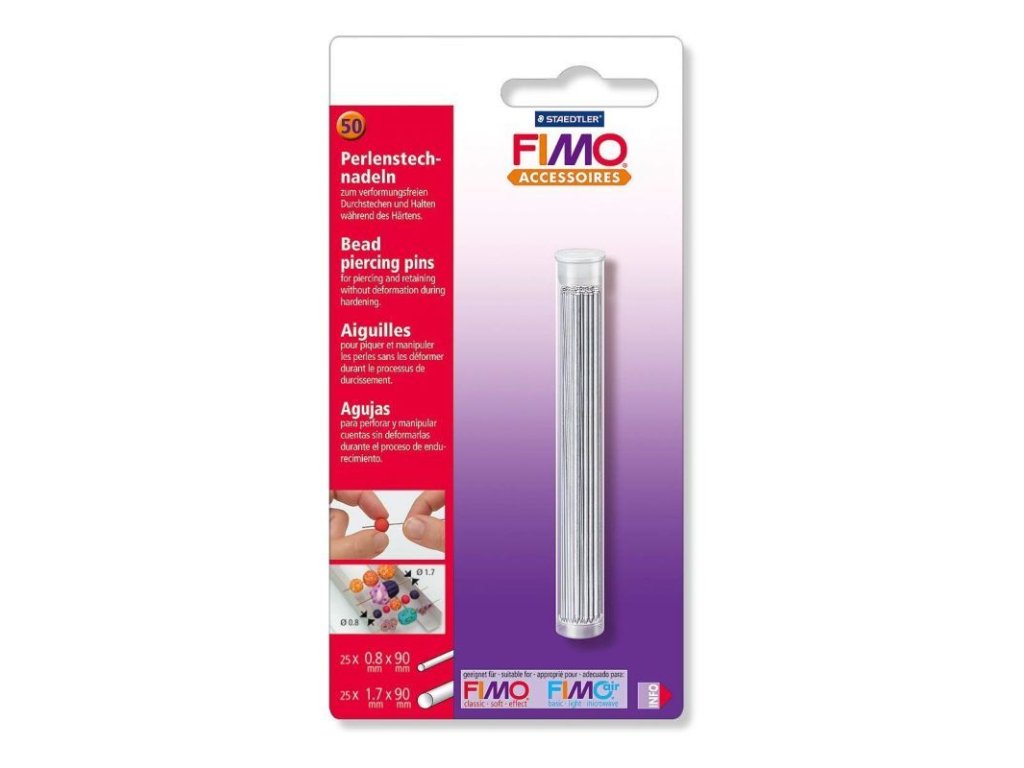 Při vytvrzování korálku je jedoduše navlékněte a dejte do trouby. Průměr 0,8mm a 1,7mm a délka 90mm, na jedné straně zabroušené do špičky. Vhodné také pro FIMOair. V plastové uzavíratelné tubě - 50ks(25+25) v balení. Jehlice se dají opakovaně použít.Doplňkové parametry