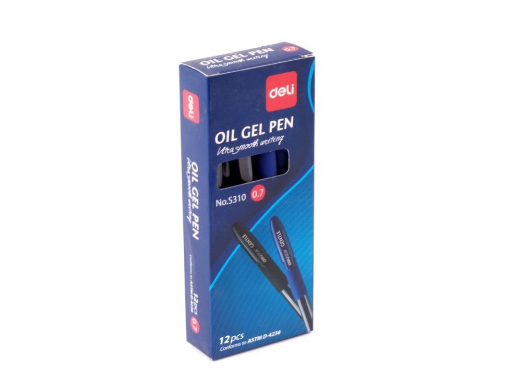 Plastové kuličkové pero Deli 0,7 mm modré, gelové olejové složení (oil gel inks pen). Příjemný a neklouzavý gumový úchop, víčko s klipem. Balení 12 ks v papírové krabičce. Cena za 1ks.Doplňkové parametry