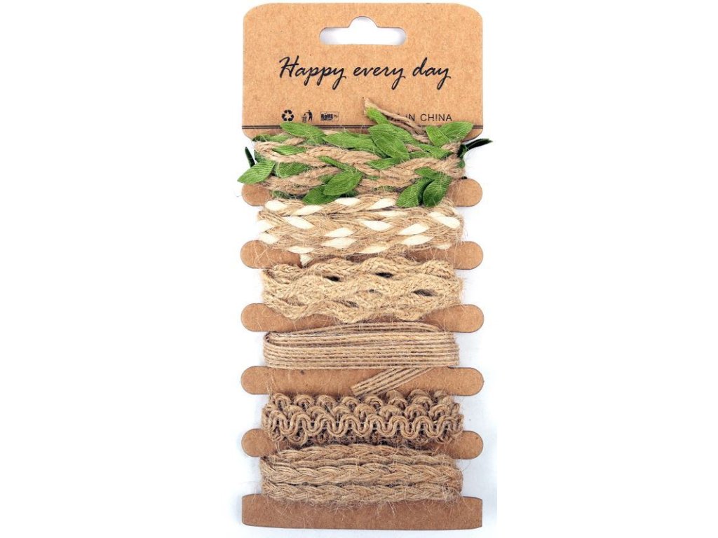 Sada 6 druhů kreativní jutové stuhy na kartonu, motiv viz obrázek. Délka návinu cca 1metr. Vhodné pro balení dárků, a různé krativní tvoření doma či ve škole. VO bal 12ks, cena za 1ks.Doplňkové parametry