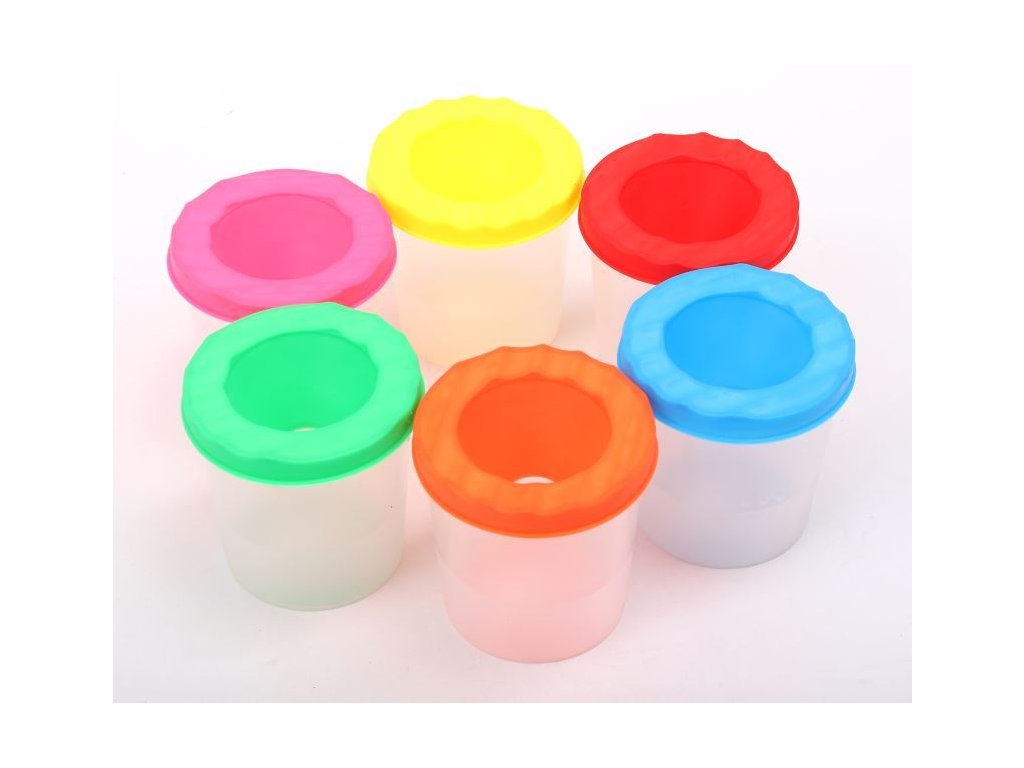 Nevylévací kelímek pro školáky na čištění štětců. Mix 6 barev (zelená, oranžová, modrá, červená, žlutá, růžová) bal 12ks, cena za 1ks.