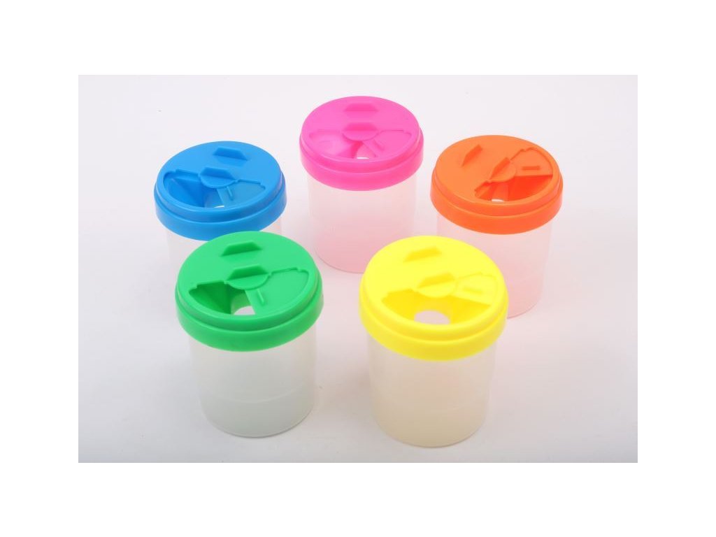 Nevylévací kelímek pro školáky na čištění štětců s uzávěrem. Rozměr 8cm x 9cm. Mix 5 barev: žlutá, zelená, modrá, růžová, červená.