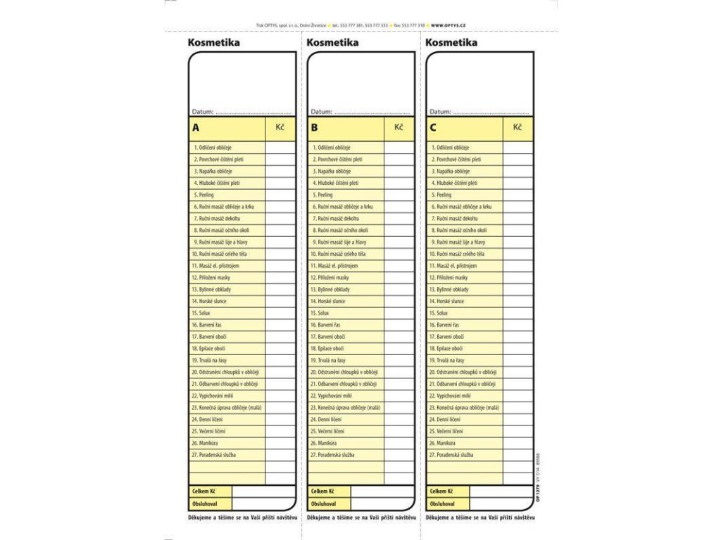 Blok pro kosmetická studia s karbonovou (propisovací) vrstvou, 100 listů, každý list má tři části, formát A5, nečíslovanýDoplňkové parametry