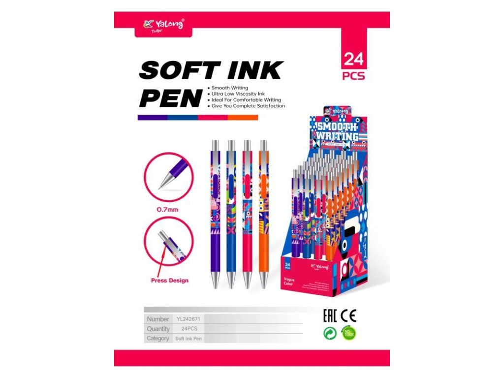 Kuličková tužka - propiska 0,5mm, modrá, olejovo gelová náplň díky které velmi jemně a hladce píše. Vhodná pro kanceláře i školáky. Mix 4 motiův, viz obrázek. VO balení 24ks, cena za 1ks.Doplňkové parametry