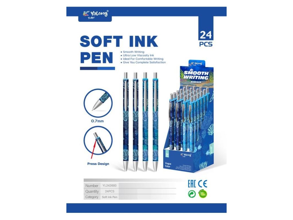Kuličková tužka - propiska 0,5mm, modrá, olejovo gelová náplň díky které velmi jemně a hladce píše. Vhodná pro kanceláře i školáky. Mix 4 motiův, viz obrázek. VO balení 24ks, cena za 1ks.Doplňkové parametry