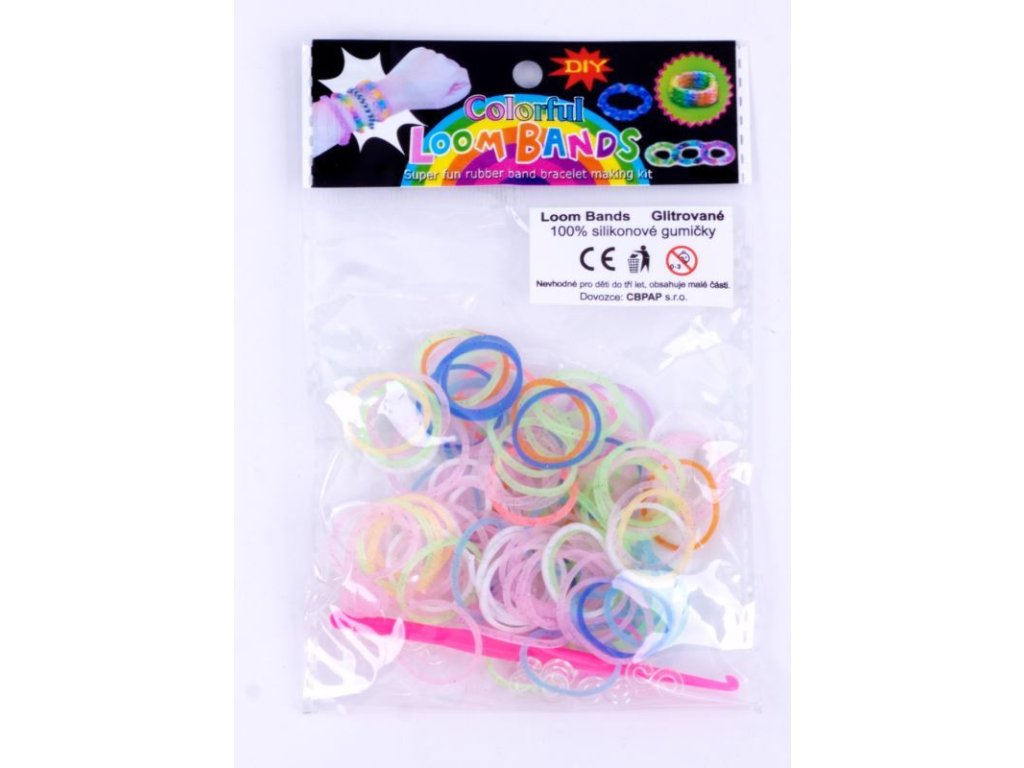 Silikonové gumičky na pletení – pro kreativní tvoření Kvalitní silikonové gumičky ideální pro výrobu náramků, prstýnků, přívěsků a dalších dekorací pomocí stavů nebo háčků. Oblíbená kreativní aktivita u dětí i dospělých. Balení 100ks gumiček + háček a 6ks spojovacích sponek. Nevhodné pro děti do 3 let.Doplňkové parametry
