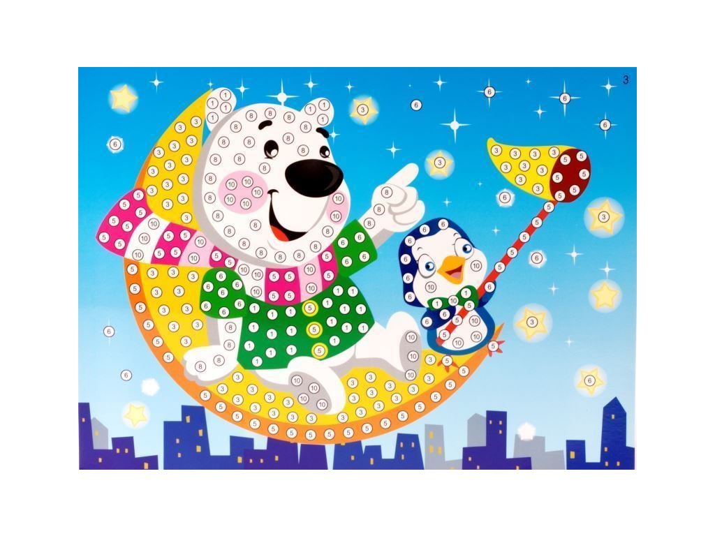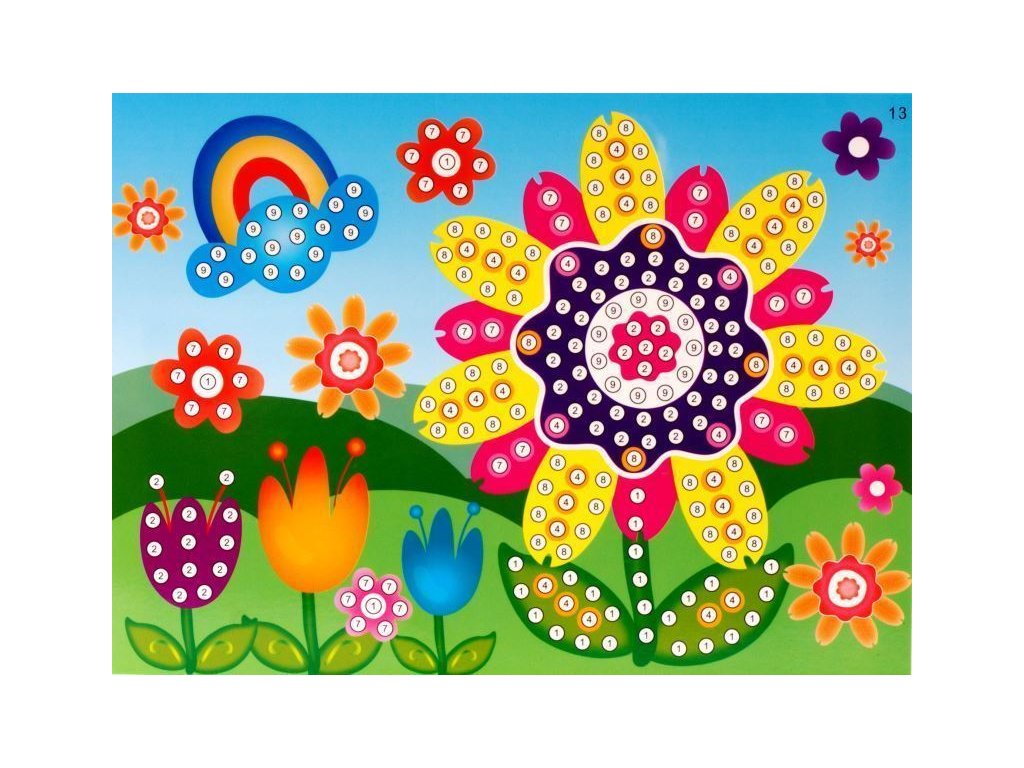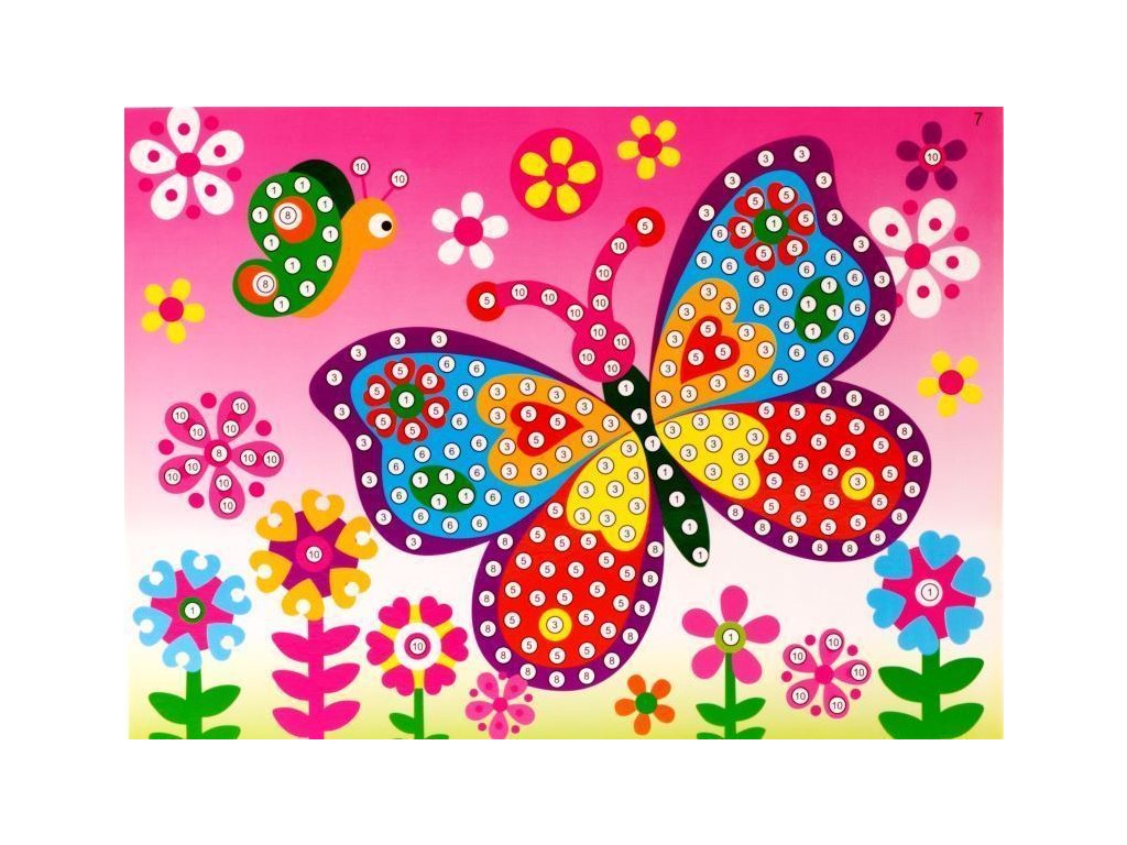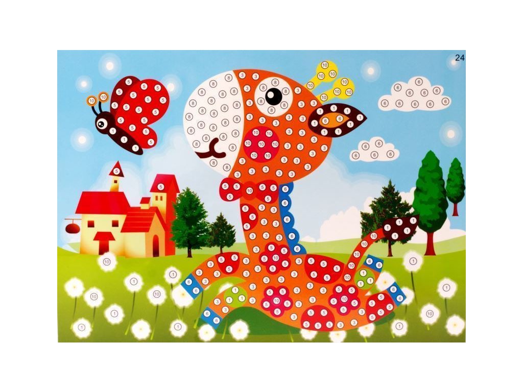 Mozajikový obrázek se samolepicími kamínky. Kreativní sada pro děti, které si rády hrají s barvami a tvořením. Dítě dotváří barevný obrázek pomocí samolepicích kamínků, které lepí podle barevného označení. Rozvíjí jemnou motoriku, trpělivost a smysl pro detail. Nevhodné pro děti do 3let.Doplňkové parametry