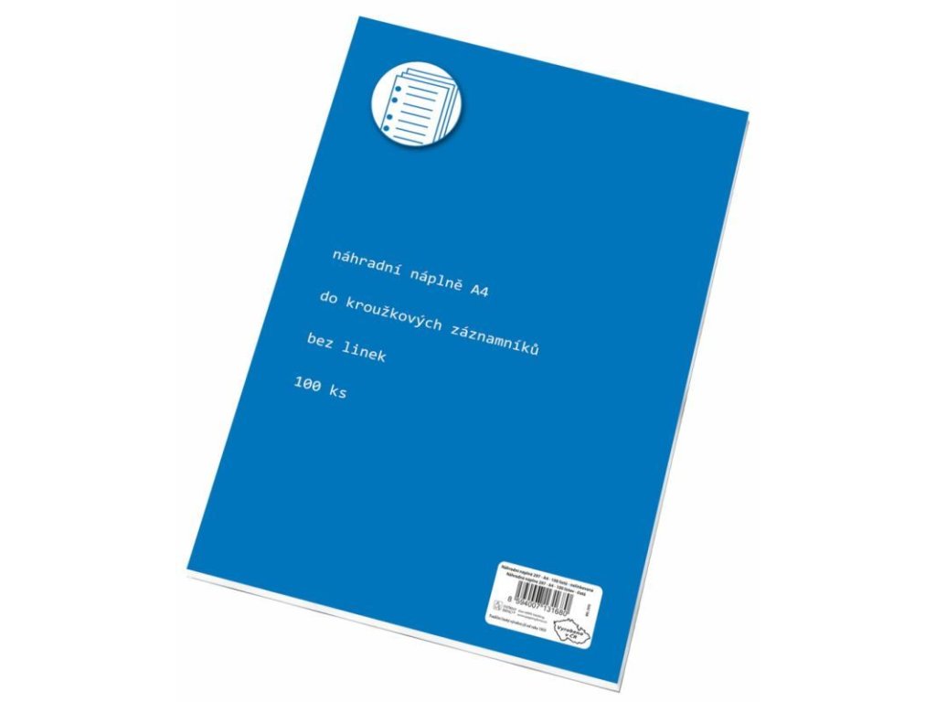 Náhradní náplň do velkých zápisníků s 4 kroužkovou mechanikou.Čistý papír. Rozměry 210 × 297 mm (formát A4) 100 listů Vyroben z hladkého bezdřevého papíru. Krycí list z lesklého křídového papíru. Typizované děrovaní pro zakládání do kroužkových mechanik (karis bloků), pořadačů či rychlovazačů.Doplňkové parametry