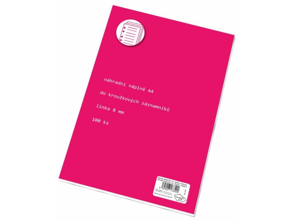 Náhradní náplň do velkých zápisníků s kroužkovou mechanikou. Linkovaný papír (8 mm). Rozměry 210 × 297 mm (formát A4) 100 listů Vyroben z hladkého bezdřevého papíru. Krycí list z lesklého křídového papíru. Typizované děrovaní pro zakládání do kroužkových mechanik (karis bloků), pořadačů či rychlovazačů.Doplňkové parametry