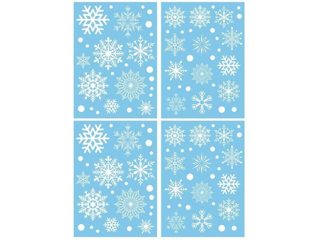 Okenní fólie vánoční A4- bílé sněhové vločky různé velikosti a druhy vloček. Mix 4 druhů na archu. Vhodné pro vánoční zdobení oken. Cena za 1 arch.Doplňkové parametry