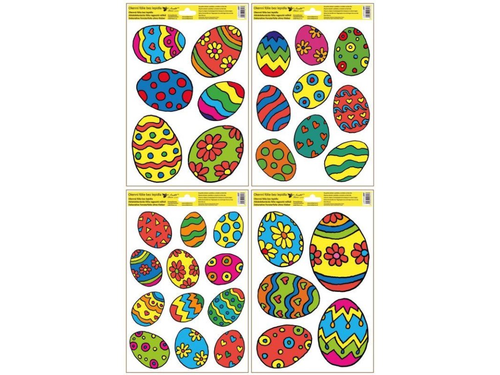 Velikonoční dekorační fólie na okno, rozměr 20x30cm, mix 4 druhy, viz obrázek. Na plochu přilnou elektrostaticky a nezanechávají tedy po sobě žádnou stopu. Vhodné jsou jakékoli hladké plochy, například sklo, výlohy, zrcadla nebo kachličky.Doplňkové parametry