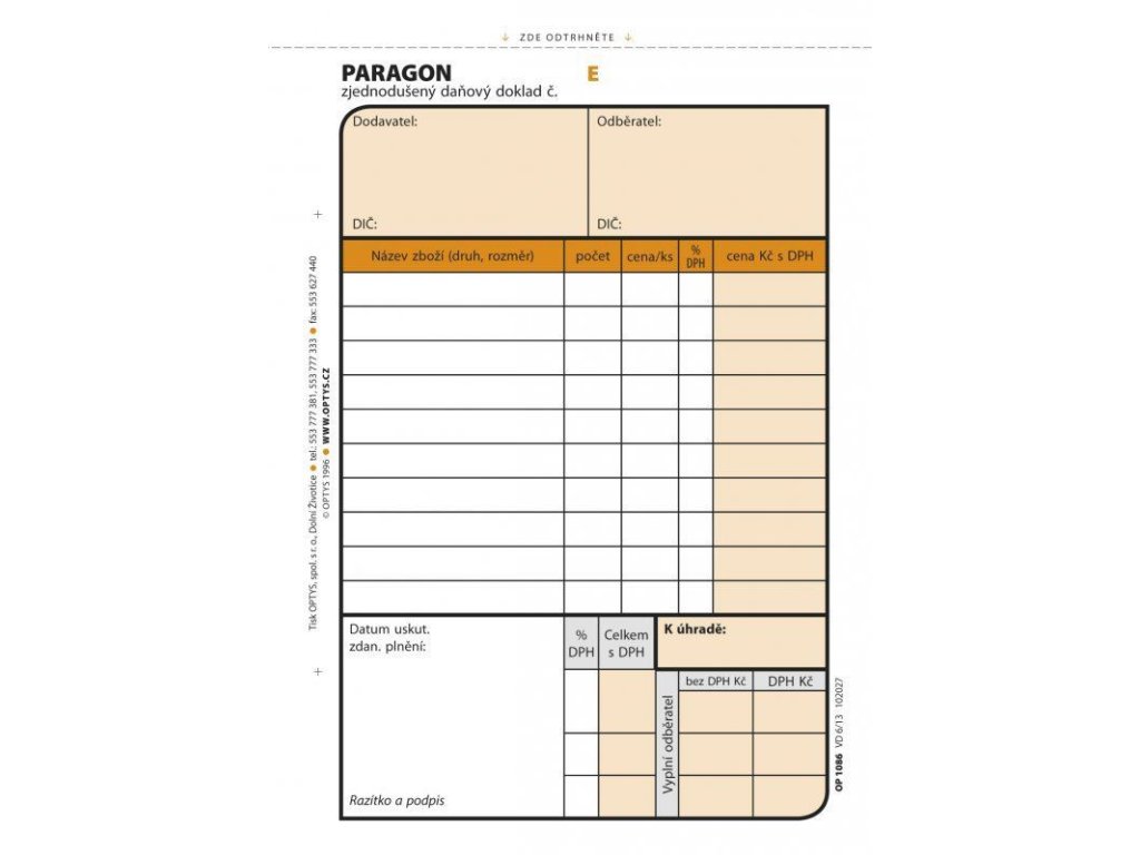 Tiskopis je dle nové legislativy přizpůsoben pro 3. daň z přidané hodnoty, došlo tedy k rozšíření kolonek,samopropisovací,číslovaný,formát A6 na výšku.Obsahuje 2 x 50 listů odtržitelných perforací, se zakládacím děrováním.Doplňkové parametry