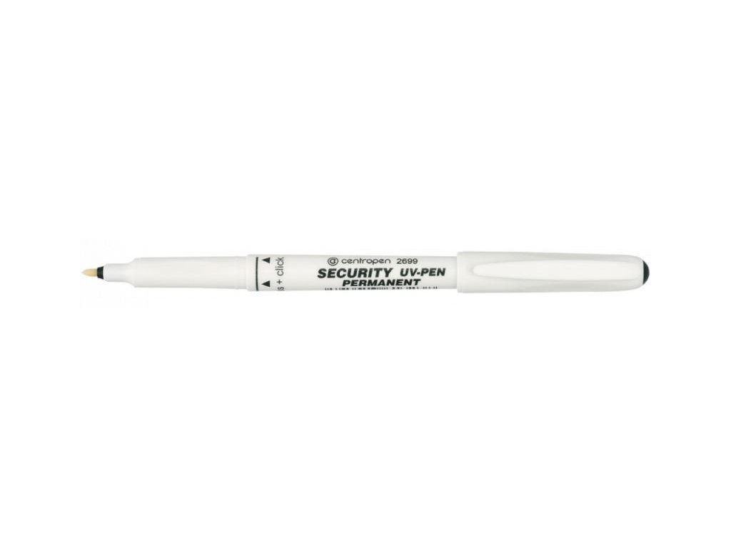 Centropen 2699/2 UV set. Slouží zejména k prevenci při ochraně majetku. Obsahuje popisovač Security UV-PEN s válcovým hrotem o průměru 2 mm a s inkoustem, jehož stopa písma je viditelná pouze při osvícení přiloženou UV lampou.Doplňkové parametry