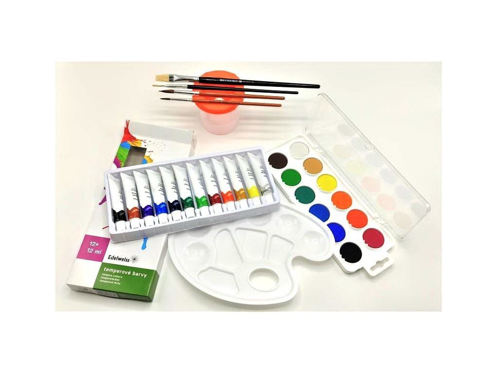 Sada obsahuje kvalitní temperové barvy Edelweiss 12 barev, paletku na míchání barev, vodové barvy - 12 barev, nevylévací kelímek, a 4 štětce, dva ploché velikost 12 a 8 a dva kulaté štětce velikost 10 a 7. Sada je vhodná pro první stupeň základní školy.Doplňkové parametry