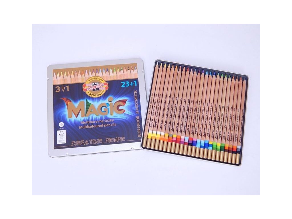 Koh-i-noor Souprava tužek barevných MAGIC 3444 N . Speciální pastelky s vícebarevnou tuhou složenou vždy ze tří odstínů. Jsou vyráběny v soupravách24 ks odstínů. Umožňují krásnou vícebarevnou kresbu se zajímavými přechody barev.Doplňkové parametry