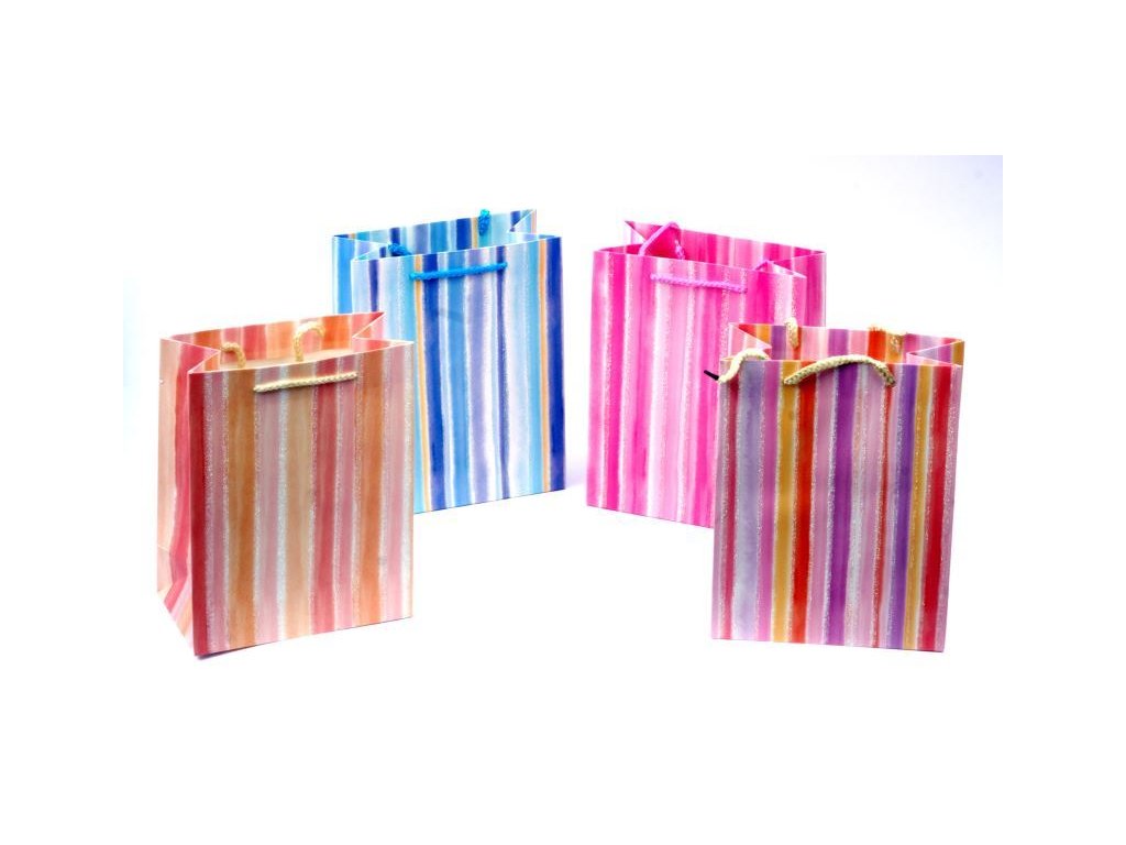 Papírová dárková taška s textilními uchy. Balení po 12 ks. Mix 4 barev.Doplňkové parametry