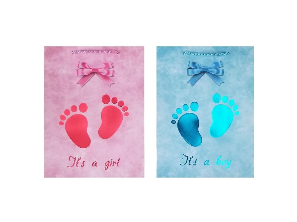 Papírová dárková taška, mix 2 druhy, pro kluky It´s a boy, pro holky It´s a girl, krásné laserem tištěné provedení, barvy růžová a modrá. Pevný materiál 210g, kroucené provázkové úchopy.Doplňkové parametry