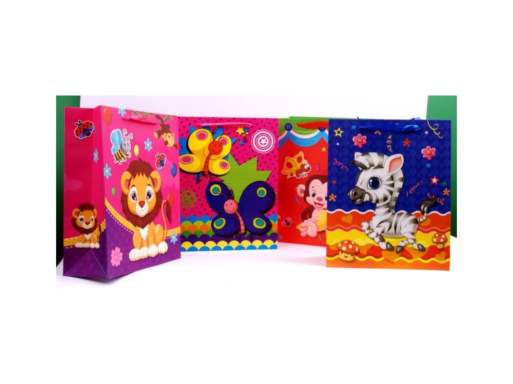 Papírová dárková taška s dětskými zvířátkovými motivy, a s textilními uchy. Mix motivů. VO bal 12ks, cena za 1ks.Doplňkové parametry