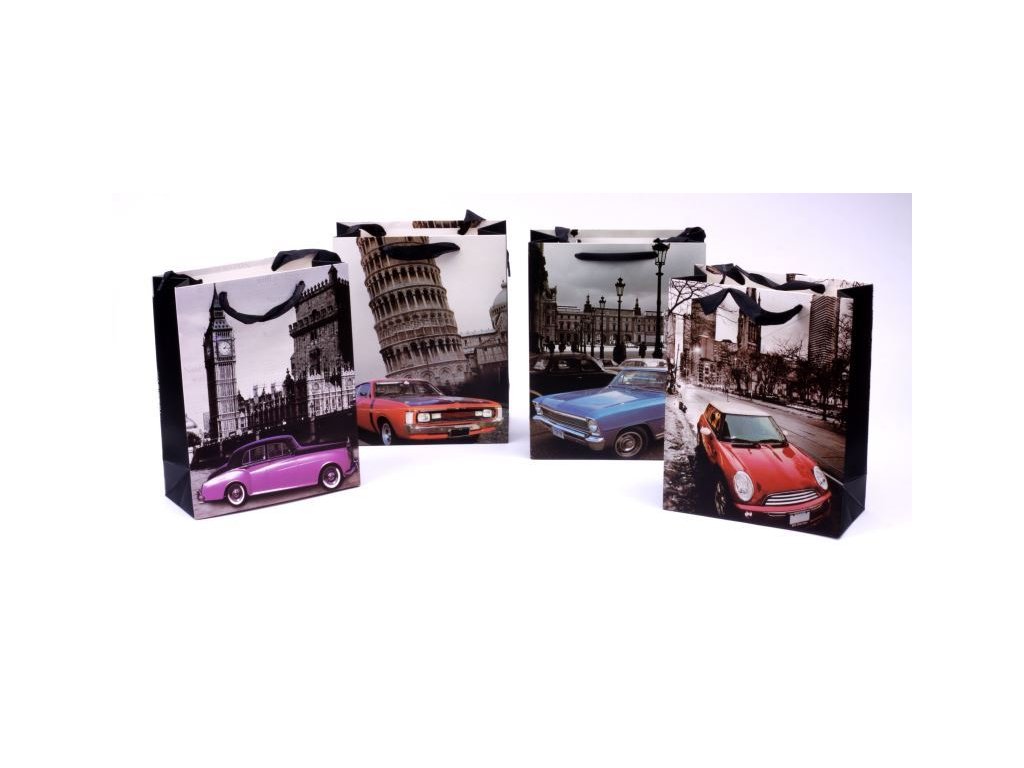 Papírová dárková taška s textilními uchy. Balení po 12 ks. Mix 4 motivů.Doplňkové parametry