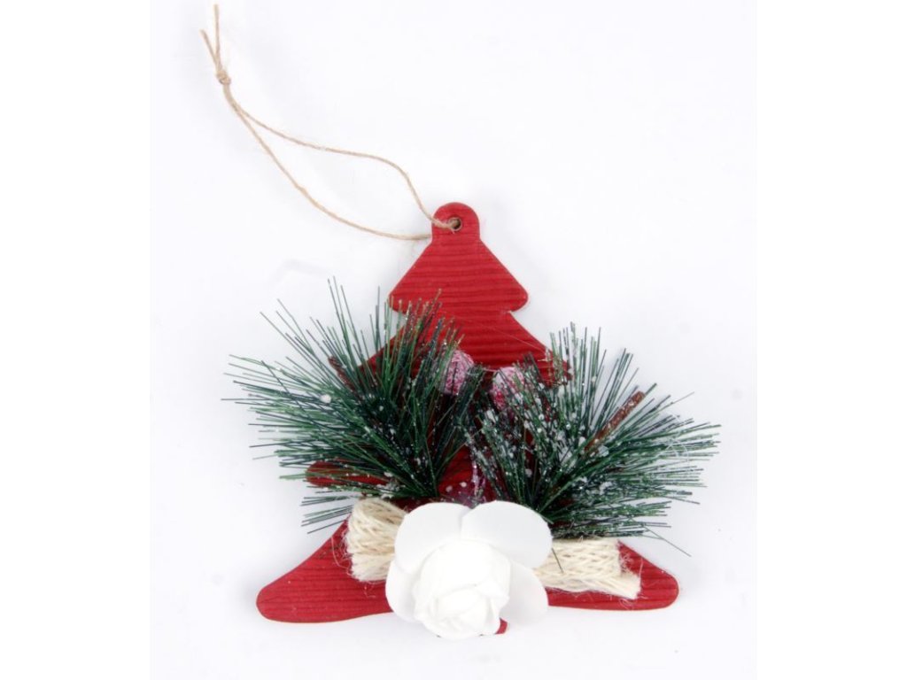 Kartonový vánoční stromek se zdobením a závěsem. Barva červená.Doplňkové parametry