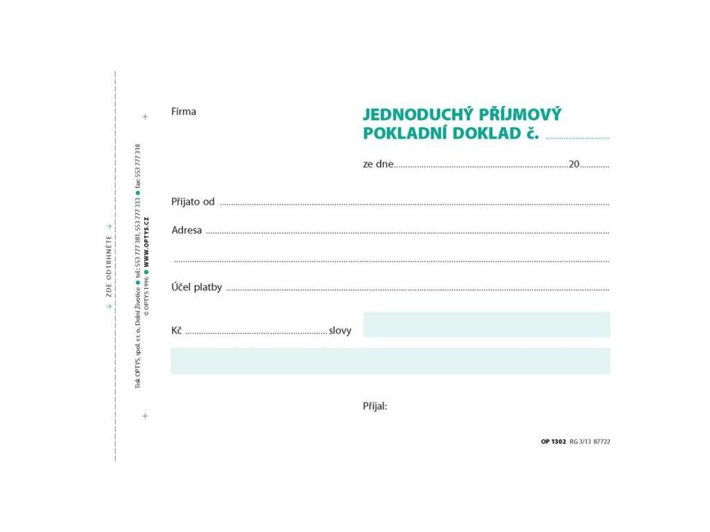 Samopropisovací, nečíslovaný. Formát A6 na šířku. Obsahuje 100 listů odtržitelných perforací, se zakládacím děrováním.Doplňkové parametry